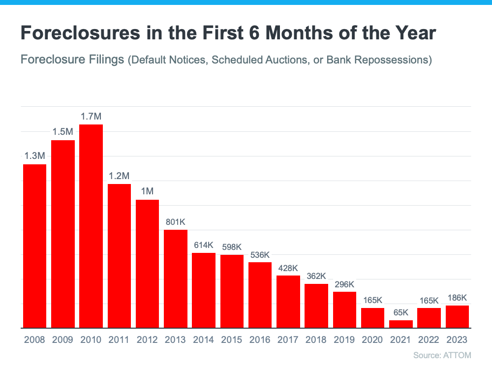 To further paint the picture of just how different the situation is now compared to the housing crash, take a look at the graph below. It uses data on foreclosure filings for the first half of each year since 2008 to show foreclosure activity has been consistently lower since the crash.
